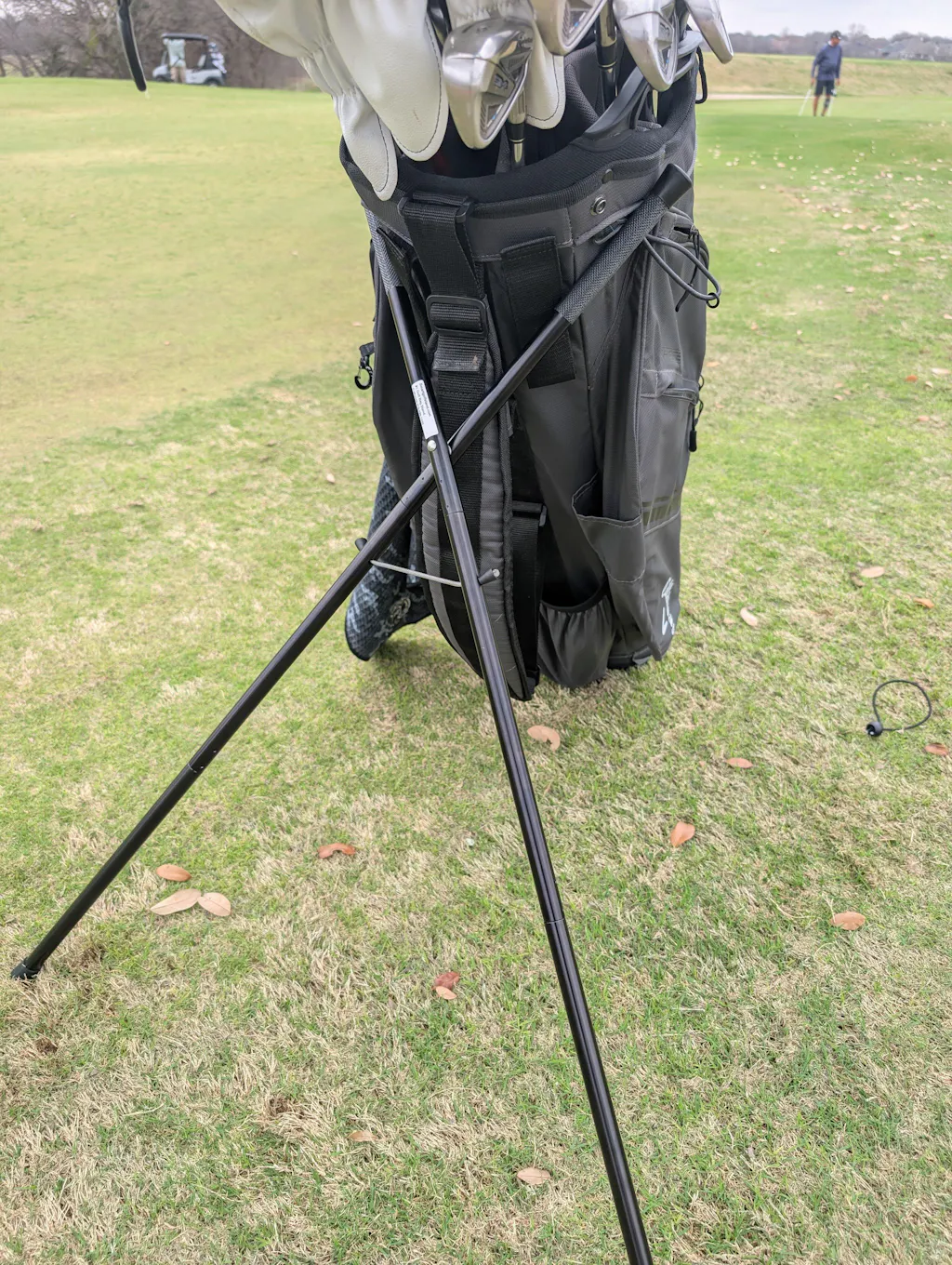 I’m so glad I came across this and bought it because it’s exactly what I’ve been looking for. I have a cart bag and not all ranges have stands so my bag kept falling over and I’d have to lay it down. This trestle stand solves that. Love the details such as how the steel wire holding the two sticks together is covered in plastic and capped so it won’t scratch the legs or club shafts if you’re storing it next to clubs. You can tell there was a lot of thought and attention to detail put into the design.